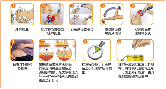 最后,我们一起学习胰岛素规范注射的九个步骤: