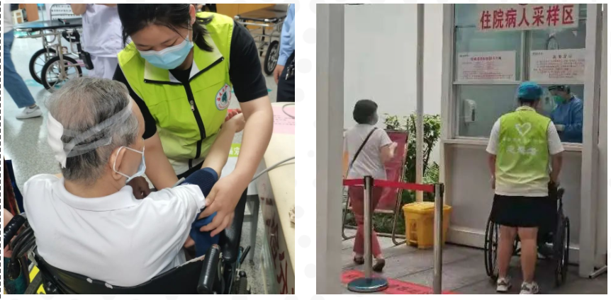 疫情期间,病房采取“一患一陪护”,志愿者协助多个科室行动不便的患者进行辅助检查,鼓励他们,以积极的心态面对治疗。同时,为患者及家属做好疫情防控健康宣教,每次服务结束,志愿者们都会相互分享心得,总结经验。