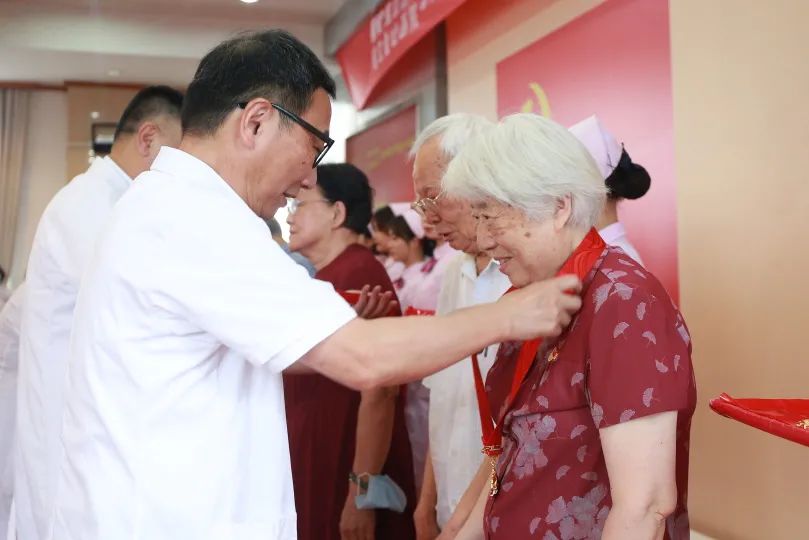 会上举行“光荣在党50年”纪念章颁发仪式,当全体院领导为老党员代表挂上沉甸甸的纪念章的那一刻,会场里响起了热烈的掌声,光芒闪闪、熠熠生辉的纪念章映照着老党员们滚烫的初心。