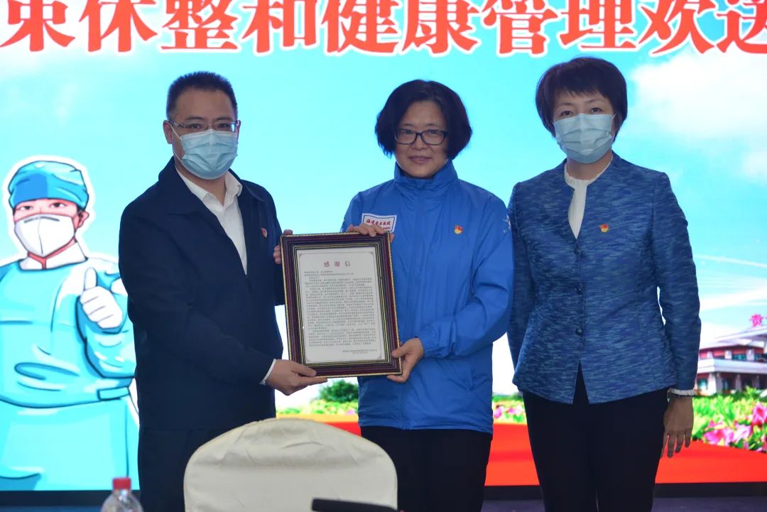 我院党委副书记、抗疫援莆医疗队领队李红送上感谢信,表达了对省直机关工委、省卫健委以及驻点酒店等负责休整保障人员的感谢。呼吸与危重症医学科主任谢宝松代表队员发言。