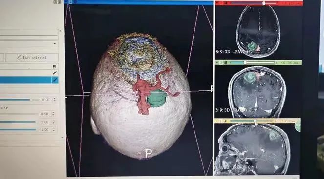 面对家属的期待,辛惠宁、王军带领科室医生详细规划手术路径,利用3DSlicer软件虚拟手术路径,模拟手术中可能存在的难点、要点,制定了一套完美的手术计划。由辛惠宁、王军2位主任共同主刀,雷辉主治医师担任助手为患者实施手术,两位主任沉着冷静,双手稳如磐石,医生们之间如同教科书般完美配合,完整的切除了肿瘤,术中仅出血20余毫升,而与肿瘤相邻的功能区无丝毫损伤,患者术后肢体功能完全恢复正常。