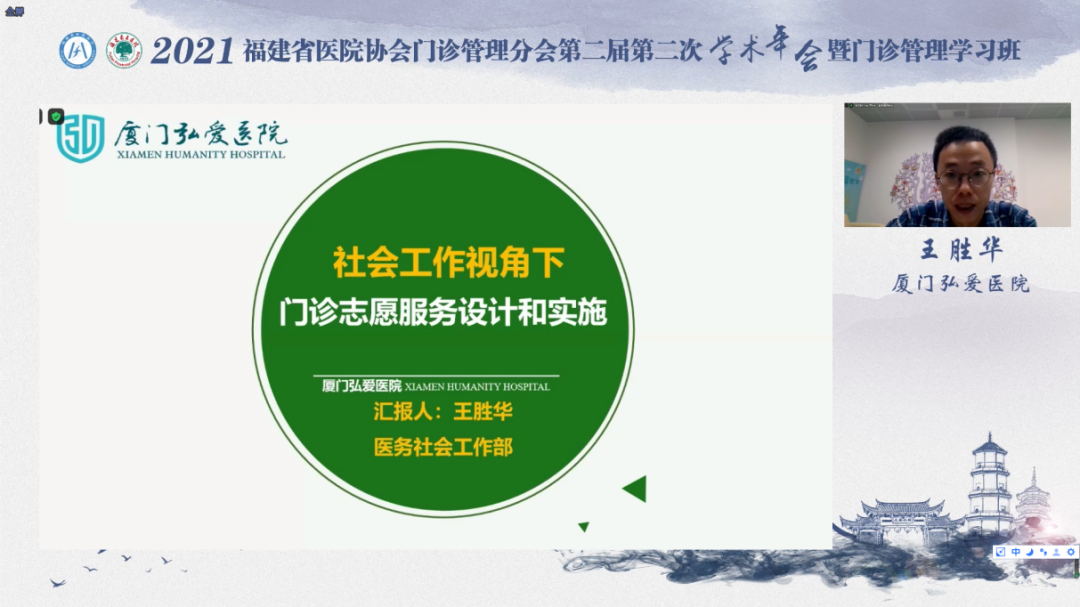 本次学习班采用线上形式召开,邀请了省内外门诊管理专家进行专题授课,内容围绕“建设智慧门诊 提升患者就医体验”“门诊绩效考核与医院高质量发展”“社会工作视角下门诊志愿服务设计和实施”“附一视角下的医院服务管理”等。授课专家分享了医院门诊管理的创新模式及管理成效,为全省各地、市、县级医院门诊管理专业人员传授门诊管理的经验与方法, 进一步推动了福建省医院门诊管理工作的顺利开展。