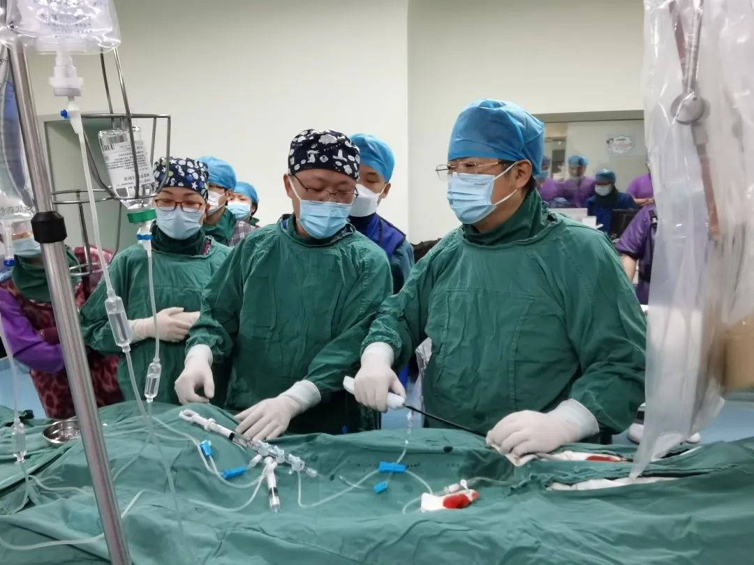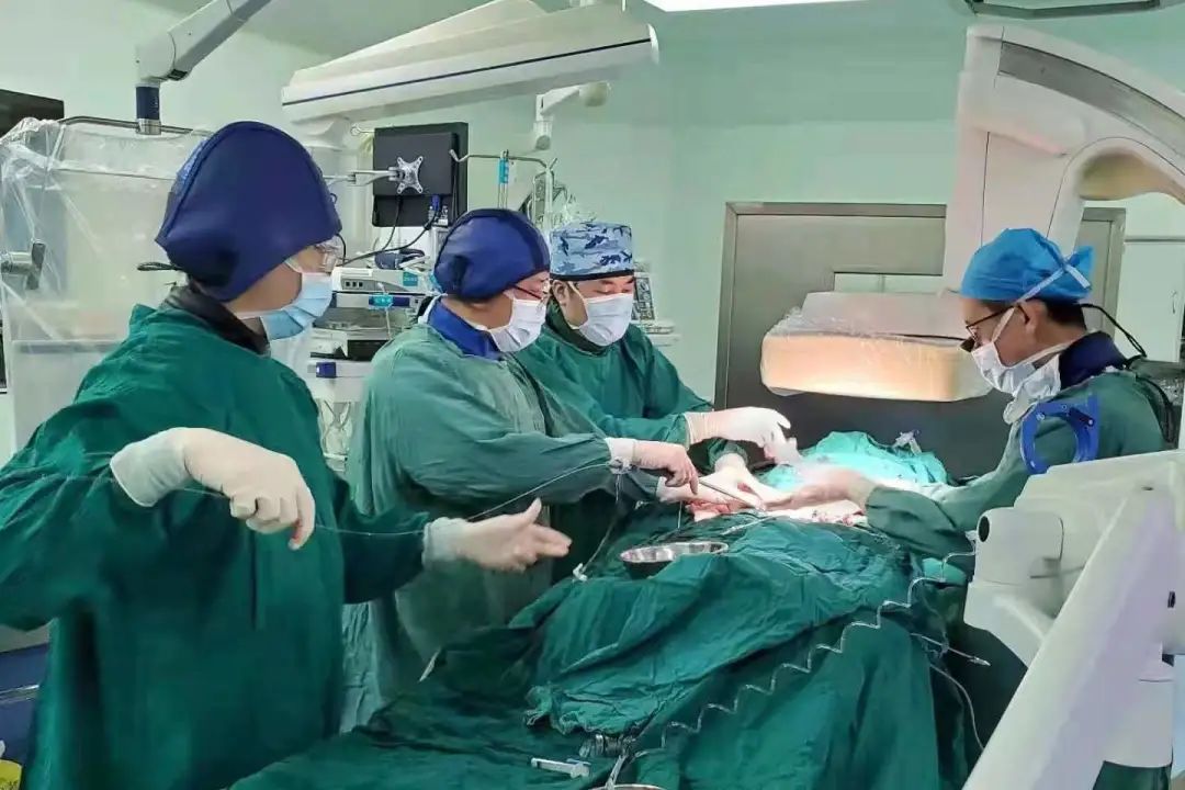 ▲郭延松教授(左二)为患者施行结构性心脏病介入手术