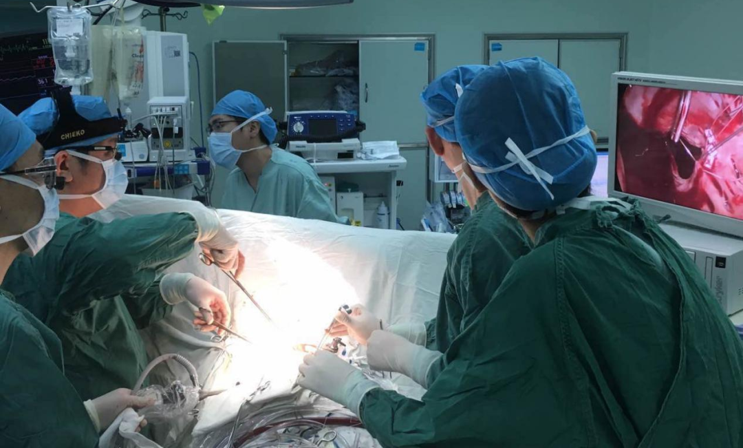 ▲翁国星教授(左二)进行电视胸腔镜再次三尖瓣置换手术