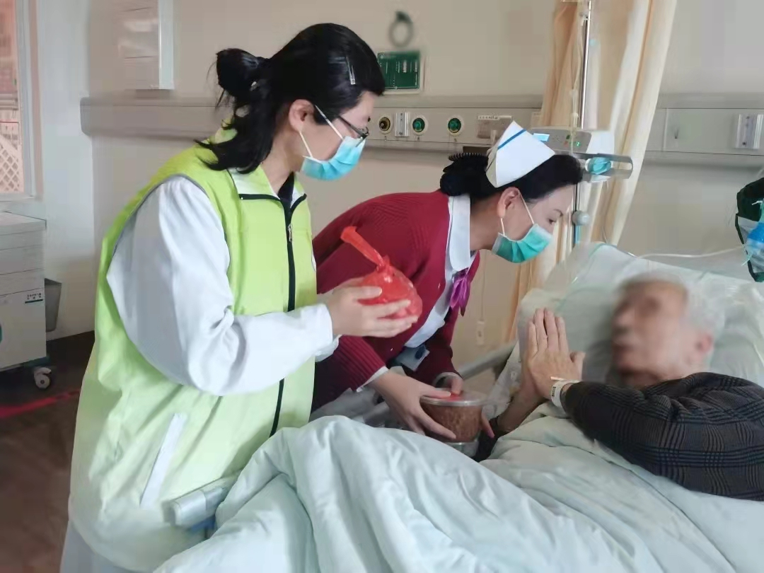 “爷爷、奶奶,今天是拗九节,蕴含着福州人的特有记忆,这是我们医务社工与志愿者的一份小小心意,祝您身体健康!您吃着热粥,感受省立的服务与温暖。”病区护士长、主管医师引导医务社工、志愿者来到患者床旁。志愿者们关切询问老人在住院期间的需求和身体情况,并叮嘱老人注意休息。伴随着一声声真诚的祝福,老人们个个喜笑颜开,连连点赞。