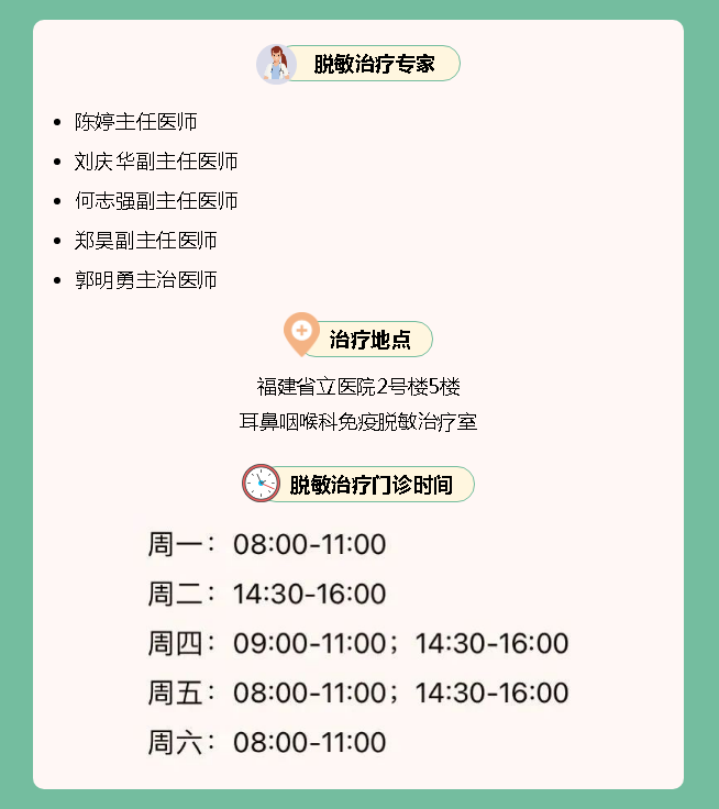 为了方便学生群体就医,除了工作日外,耳鼻咽喉科还在每周六上午设置了专家门诊,由陈婷主任医师、刘庆华副主任医师、何志强副主任医师、郑昊副主任医师、郭明勇主治医师等专家团队出诊。同时借助“脱敏治疗预约秒应小程序”,让患者在就诊时间预约选择方面可以更灵活、自由。