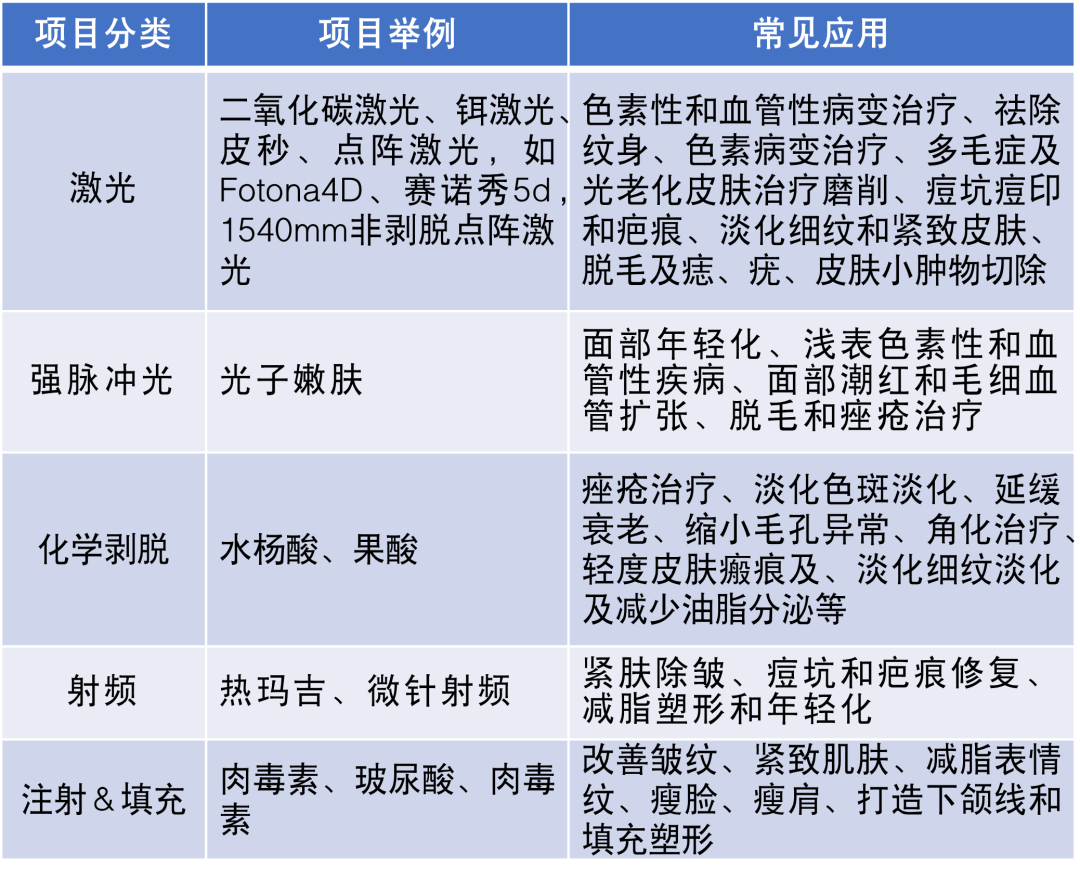 医美项目分类较多,其作用机理、功能效果也各有不同。以下是一些常见项目: