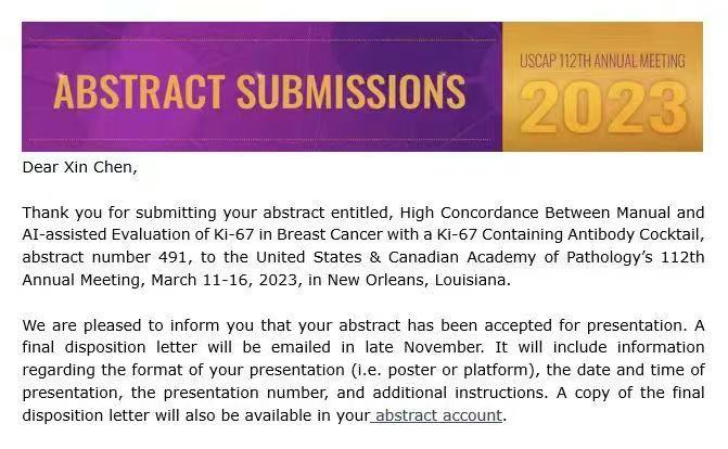 近日,福建省立医院病理科副主任陈新主任医师团队主持完成的研究成果《High Concordance Between Manual and AI-assisted Evaluation of Ki-67 in Breast Cancer with a Ki-67 Containing Antibody Cocktail》入选美国和加拿大病理学会(USCAP)年会壁报展示。