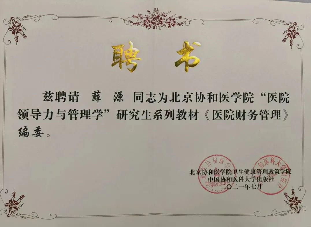 近日,北京协和医学院系列规划教材——医院领导力及管理系列教材《医院财务管理》正式出版,我院薛源高级会计师为参编专家之一。