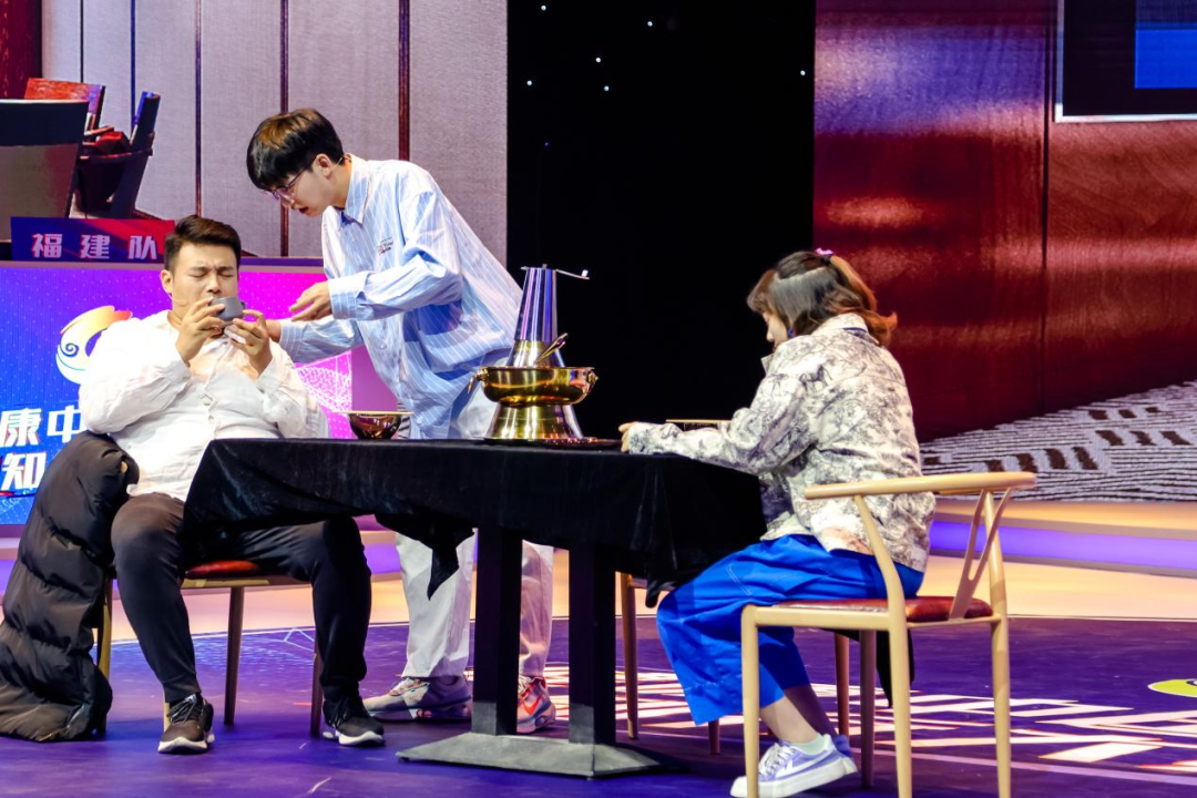 第三轮比赛进入胶着阶段,在“大咖出题”环节,一系列“救命”知识让人受益匪浅,其中实操题的科普情景剧“吃火锅”更是贴近人们生活,让专家给在场及屏幕前的观众好好上了一节“一氧化碳中毒”抢救知识讲座。福建队最后沉着冷静的一题答辩为自己又赢得了30分。至此三轮比赛过后,福建队总分稳居第一。