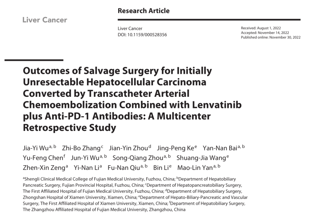 近日,肝胆胰外科严茂林博士课题组又有新成果,吴嘉艺副主任医师撰写的临床研究“Outcomes of Salvage Surgery for Initially Unresectable Hepatocellular Carcinoma Converted by Transcatheter Arterial Chemoembolization Combined with Lenvatinib Plus Anti-PD-1 Antibodies: A Multicenter Retrospective Study” 在国际权威期刊《Liver Cancer》 (JCR 1区, IF:12.43)发表。这也是严茂林博士中晚期肝癌转化治疗课题组继去年在《Journal of Hepatocellular Carcinoma》(JCR 2区, IF:5.828)发文后的又一力作。
