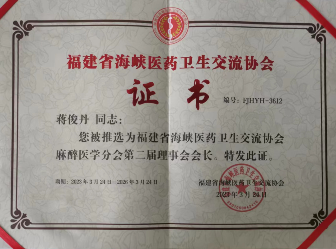 经全体理事表决,我院麻醉与围术期临床医学中心蒋俊丹主任医师当选第二届会长,陈江湖副主任医师为副会长兼秘书,涂文劭副主任医师为理事兼秘书。