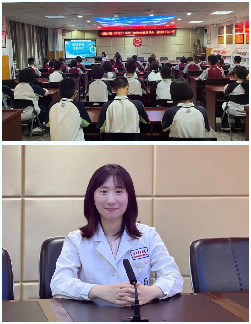 陈晗博士应邀为福州第十九中学学生开展了一场有趣的眼健康科普课堂。通过通俗易懂的语言和生动活泼的科普动画,向学生们普及了眼睛结构、视觉发育和科学用眼等知识,促进同学们对眼健康知识的了解,增强对眼睛保护的意识,让爱眼护眼成为学生们的一种习惯和自觉。