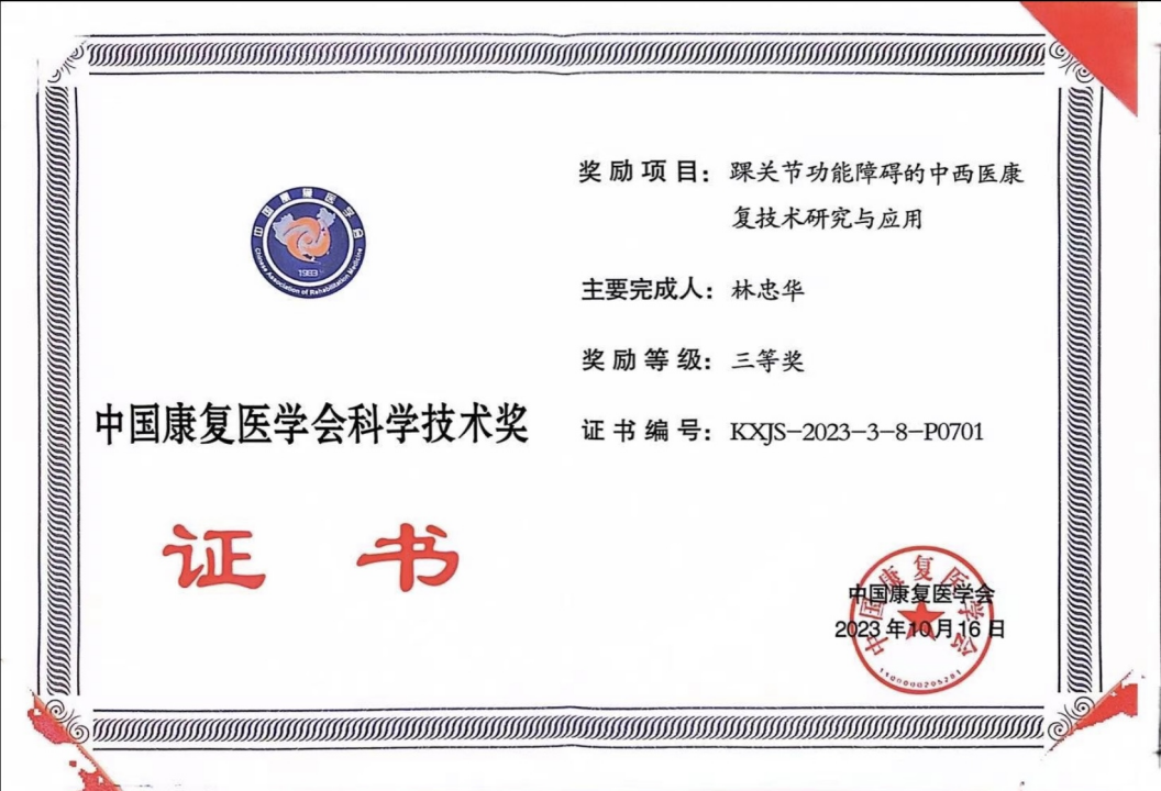 近日,在中国康复医学会综合学术年会上,我院康复二科林忠华主任医师的“踝关节功能障碍的中西医康复技术研究与应用”项目荣获中国康复医学会科学技术奖三等奖。
