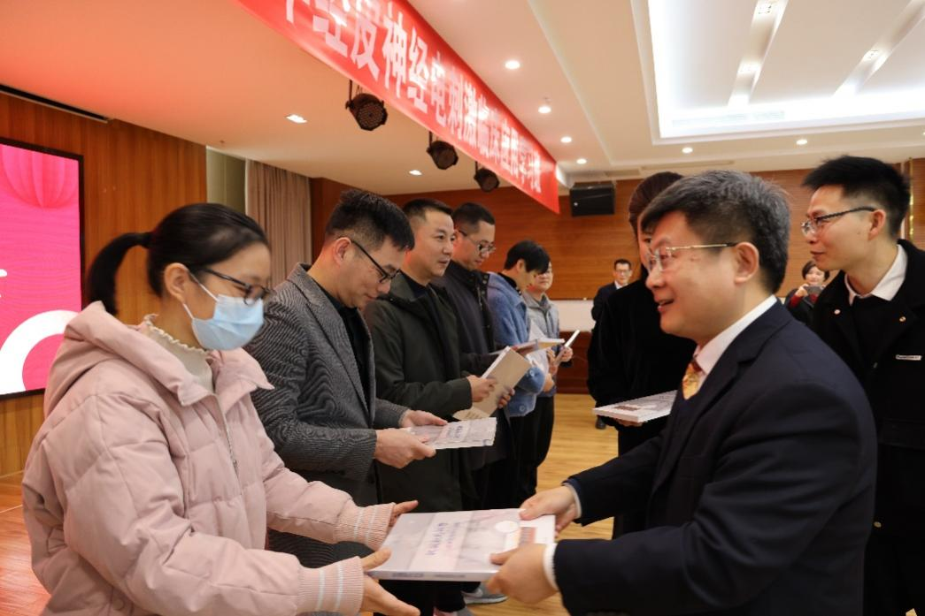 ▲刘荣国教授向三明市医学会疼痛学分会成员赠送专著《软组织外科学—密集型银质针治痛》