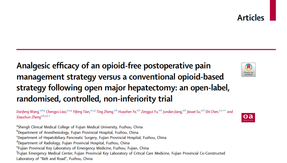 2023年8月,郑晓春教授团队联合肝胆胰外科团队在eClinicalMedicine(中科院1区,IF:15.1)杂志在线发表了题为“Analgesic efficacy of an opioid-free postoperative pain management strategy versus a conventional opioid-based strategy following open major hepatectomy:an open-label, randomised, controlled, non-inferiority trial”的研究论文。该研究证明了“改良的超声引导下连续竖脊肌阻滞技术”在开放肝切除术后的良好镇痛效果,提出了全新的围术期管理新概念。