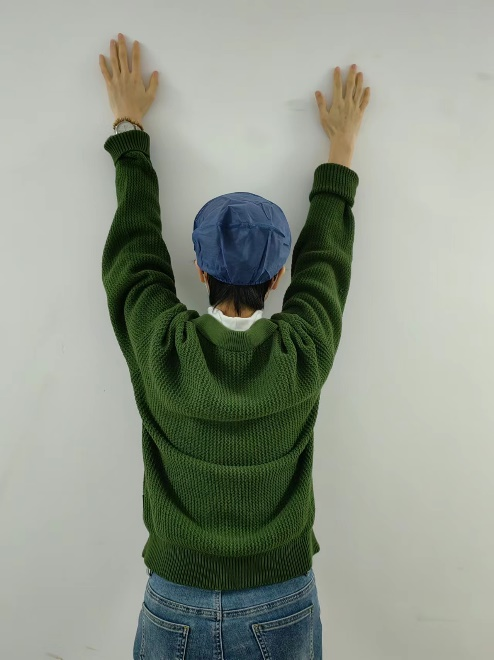 正面(或侧面)向墙,距墙30厘米,以手指爬墙,并将身体贴近墙壁,可在墙上做记号,看看是否一天比一天进步。