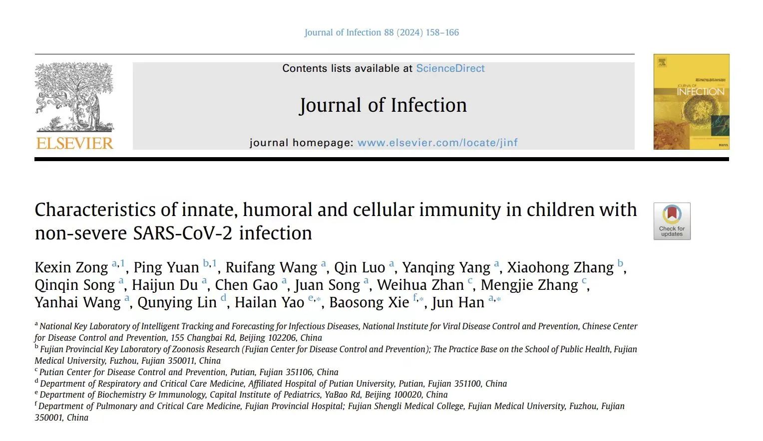 近日,国际感染疾病领域顶级期刊《J Infect》(中文名:感染杂志,影响因子28.20》发表了我院胸部医学中心•呼吸与危重症医学科谢宝松教授团队参与合作研究的最新成果,“Characteristics of innate, humoral and cellular immunity in children with non-severe SARS-CoV-2 infection”,该研究通过分析感染新冠病毒儿童的炎症反应及其免疫应答,从而揭示机体免疫反应特征,将可能助力优化新冠病毒感染防治方案。