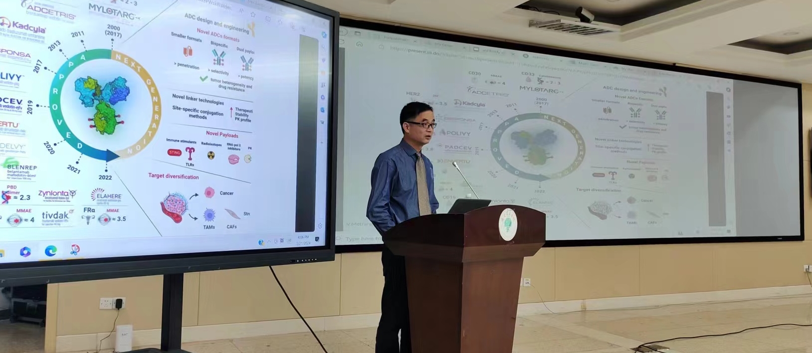 3月21日下午,我院在5号楼5层会议室举办了一场关于抗体药物偶连物(ADC)对实体瘤的精准治疗的科研讲座。本次讲座邀请了哈佛医学院丹娜法伯癌症研究所的高级肿瘤药师、美国塔夫茨大学总医院的高级临床药师温国霖博士担任主讲人。讲座由我院科研处主持,我院各科室科研骨干代表参加了讲座。