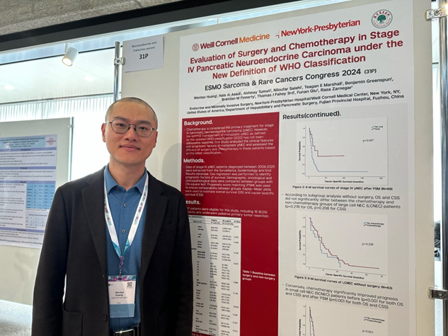 近日,我院肝胆胰外科黄文涛副主任医师受邀赴瑞士出席欧洲肿瘤学会(ESMO)肉瘤和罕见肿瘤年会,并就《世界卫生组织最新分类体系下Ⅳ期胰腺神经内分泌癌的手术和化疗策略》进行壁报展演交流。