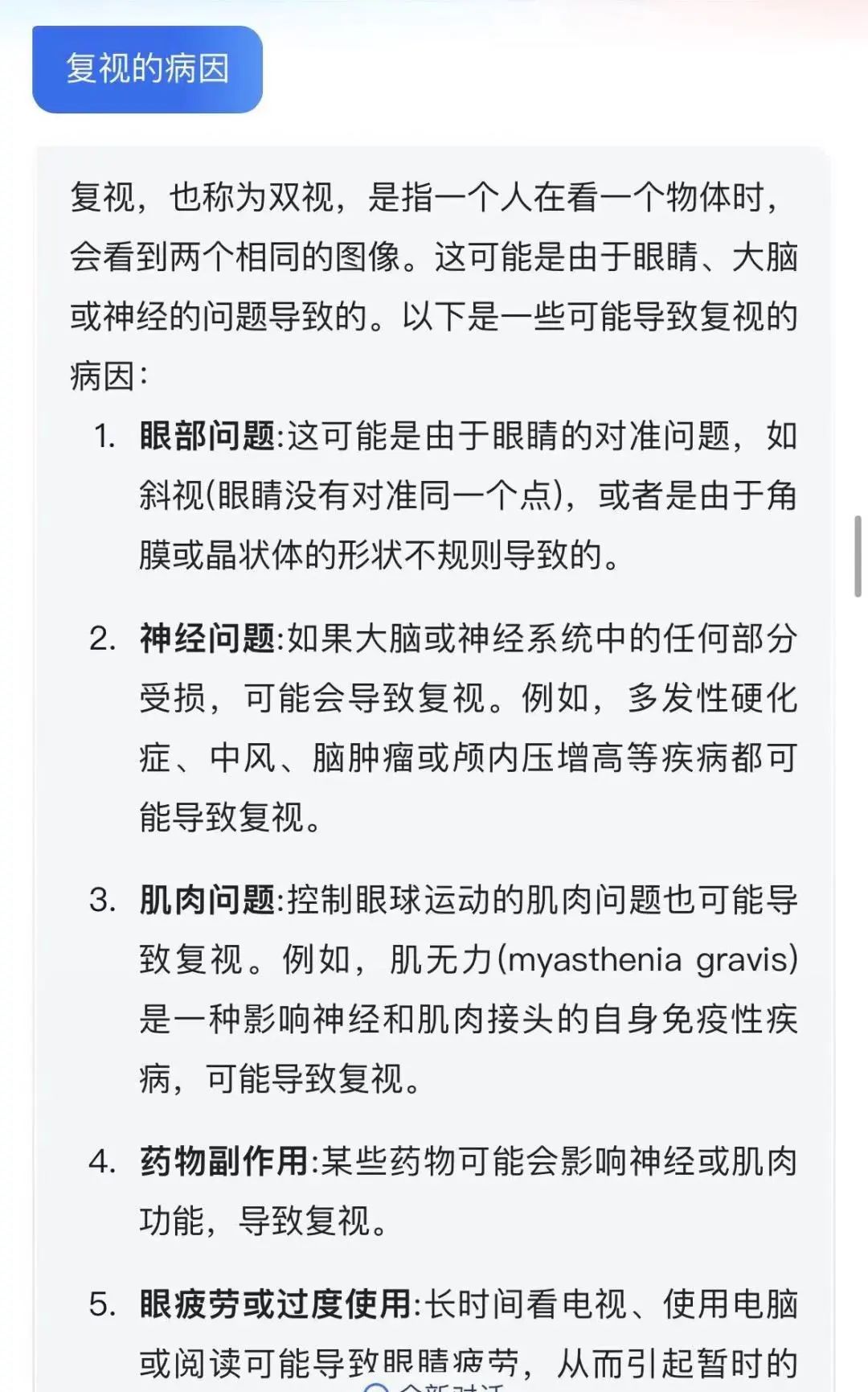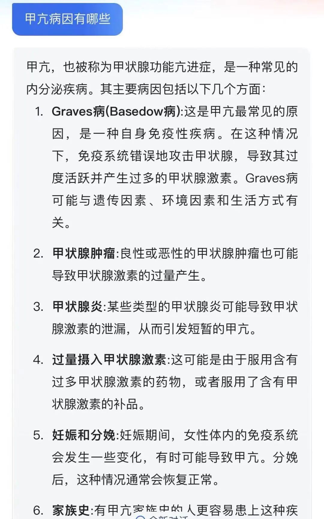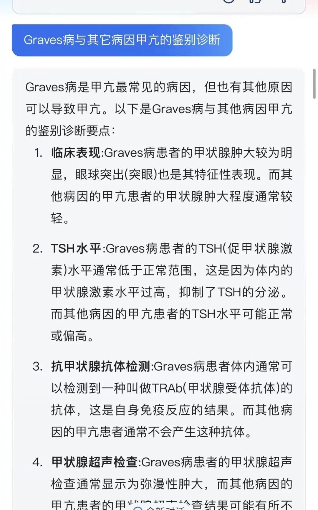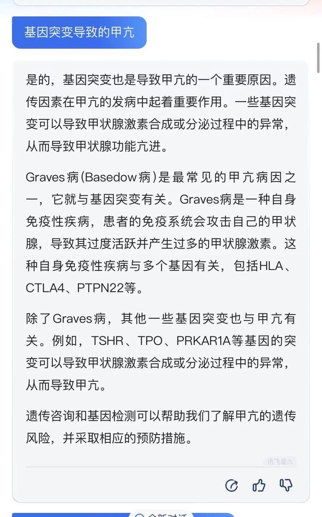 以“发病机制”为导向总结临床问题,如复视的病因、Grave’s病的发病机制、Grave’s病与其他病因甲亢的鉴别诊断、Grave’s眼病的发病机制、Grave’s眼病的病情评估等,通过向“讯飞星火”提问来获取答案并展开讨论。参与查房的医师均对生成式人工智能工具表现出极大兴趣及关注,期待日后更熟练的应用。