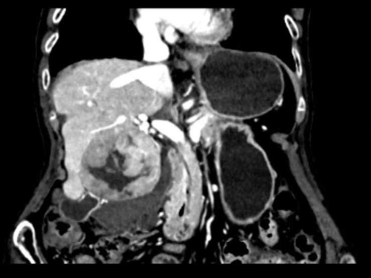 已90岁高龄的洪老太太,被突如其来的腹部剧痛袭击,急诊入院检查发现她的肝门区有一个7.1厘米的巨大肿瘤,并不幸发生自发性破裂,导致内出血,情况十分凶险。