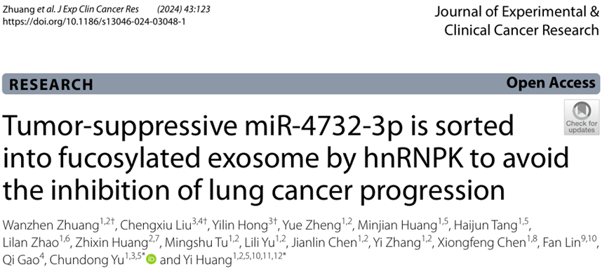 近日,我院临床医学实验研究中心黄毅教授团队与柔性引进高层次人才厦门大学生命科学学院俞春东教授团队在国际肿瘤学领域权威期刊《Journal Of Experimental & Clinical Cancer Research》(中科院一区,影响因子11.3)发表合作研究的最新成果,“Tumor-suppressive miR-4732-3p is sorted into fucosylated exosome by hnRNPK to avoid the inhibition of lung cancer progression”。
