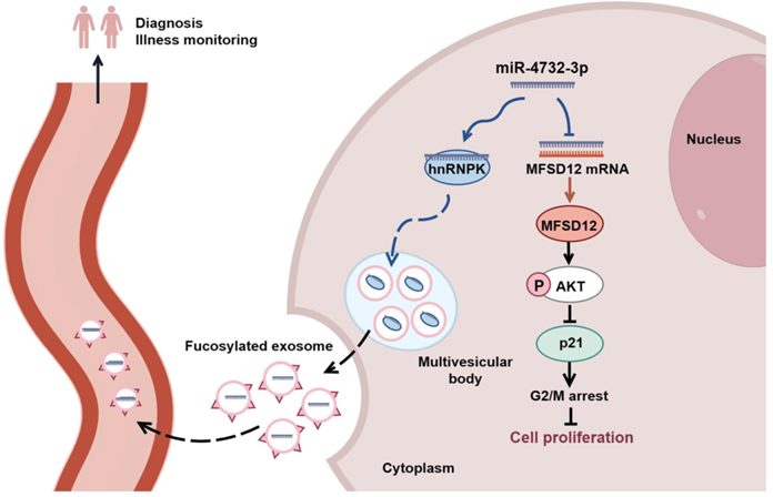 肿瘤细胞能够通过外泌体释放具有抗癌功能的分子以维持肿瘤的恶性发展,这一现象被称作“外泌体逃逸”机制。该研究发现NSCLC患者血清岩藻糖基化外泌体中高表达的miR-4732-3p,在NSCLC细胞内显示出显著的抑癌活性。在细胞内,miR-4732-3p通过结合并调控MFSD12 mRNA的3'UTR区域,降低其表达水平,进而抑制AKT/p21信号传导途径,导致G2/M期细胞周期阻滞,有效抑制了NSCLC细胞的增殖和肿瘤形成。有趣的是,研究结果发现NSCLC细胞倾向于通过hnRNPK蛋白将抑癌的miR-4732-3p分选到岩藻糖基化外泌体中,而非将其保留在细胞内,以此逃脱miR-4732-3p的抑癌作用。此外,当敲除hnRNPK时,可以抑制miR-4732-3p的外泌体分选,从而使miR-4732-3p发挥其抑癌作用,进而抑制NSCLC细胞增殖和肿瘤生成,表明针对hnRNPK蛋白进行靶向干预以阻断miR-4732-3p的“外泌体逃逸”现象,有望成为NSCLC新的治疗靶点。