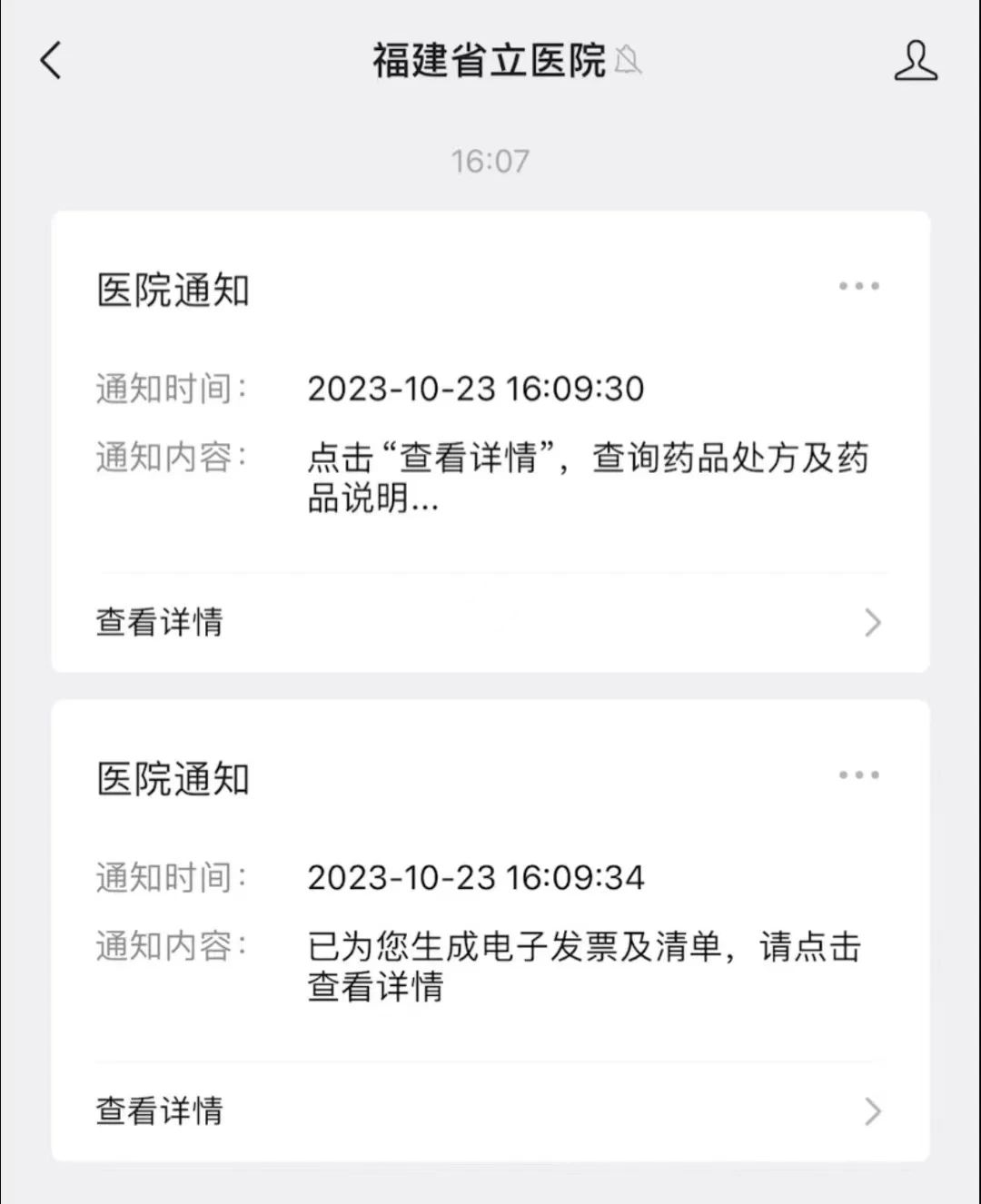 门诊患者在自助机结算完成后,“福建省立医院”微信公众号将推送一条“医院通知”,点击“查看详情”,即可实时预览电子票据及收费明细。