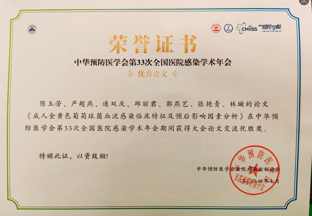 中华预防医学会第33次全国医院感染学术年会同期举行,医院感染管理部陈玉芳、张艳青、金丹等共有4篇论文参与大会交流。其中陈玉芳等的《成人金黄色葡萄球菌血流感染临床特征及预后影响因素分析》获大会论文交流优秀论文。