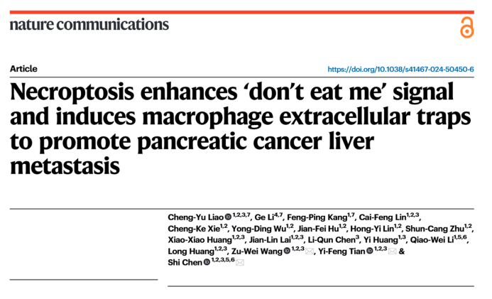 近日,我院肝胆胰外科陈实教授团队在国际著名期刊《Nature Communications》发表题为“Necroptosis enhances ‘don’t eat me’ signal and induces macrophage extracellular traps to promote pancreatic cancer liver metastasis”的重要原创研究成果,该研究展示了胰腺癌可采取“牺牲小我,完成大我”的方式完成早期肝脏转移,为胰腺癌肝转移患者提供了全新的辅助治疗策略。本研究的第一作者为肝胆胰外科廖承煜博士。
