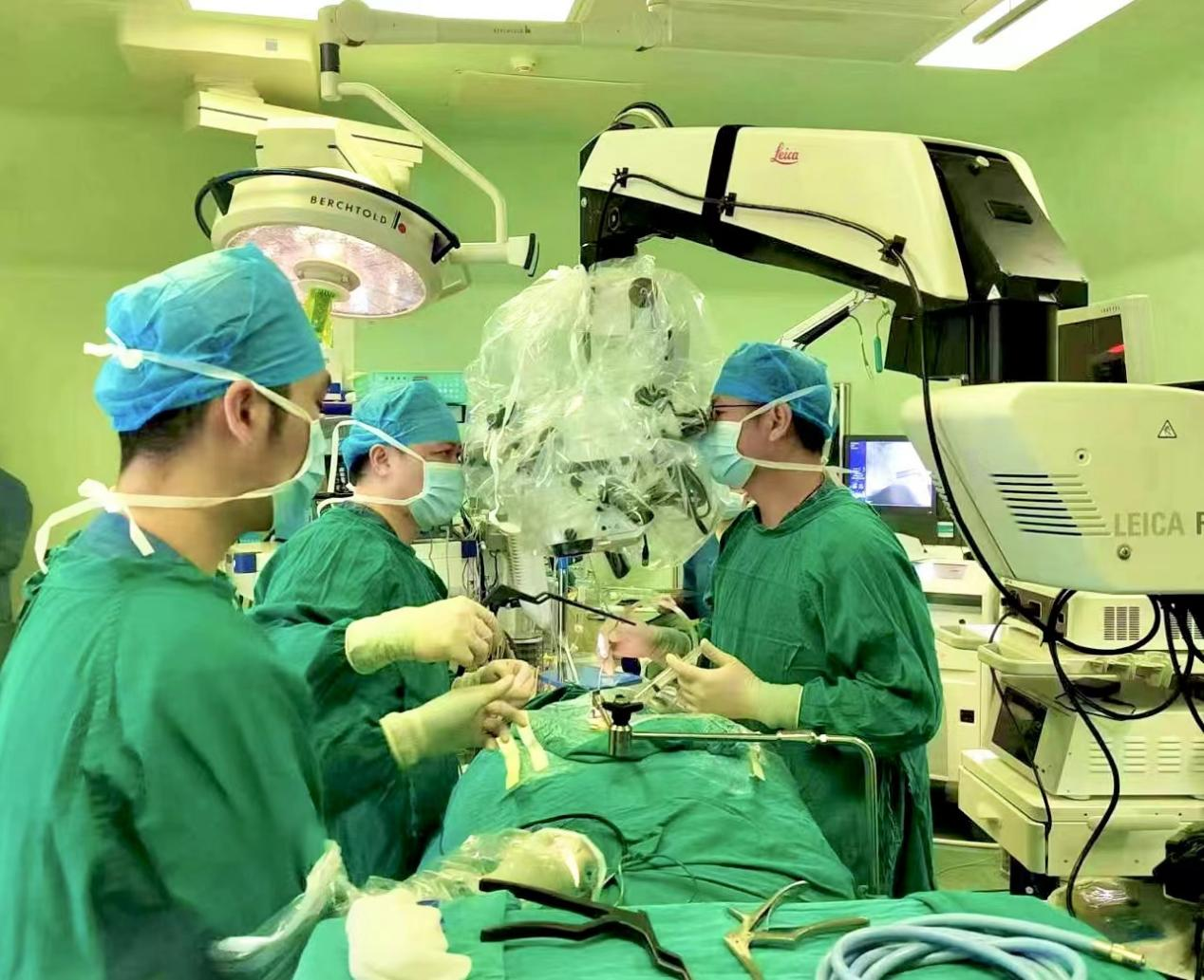 徐杰教授、肖毓华副主任医师、俞云龙博士,在机器人导航下应用显微镜摘除椎管肿瘤