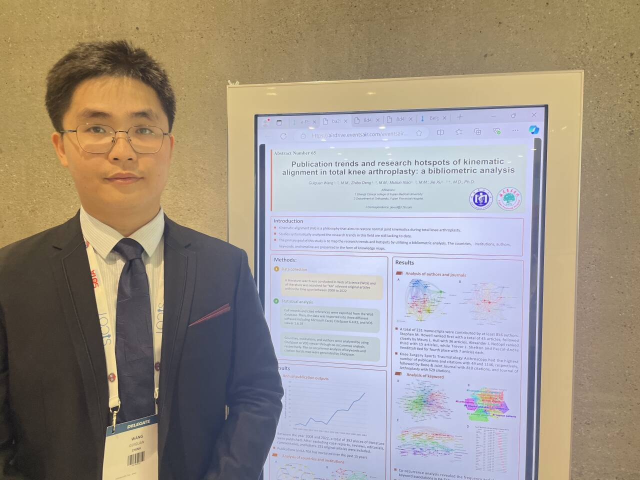 关节矫形团队的王桂冠硕士代表团队,在大会上进行电子壁报交流,研究成果题为“ Publication trends and research hotspots of kinematic alignment in total knee arthroplasty : a bibliometric analysis ” 。同来自美国、欧洲、日本、马来西亚等国家的多位知名骨科专家,对目前最先进的膝关节研究和临床应用进行了研讨交流。