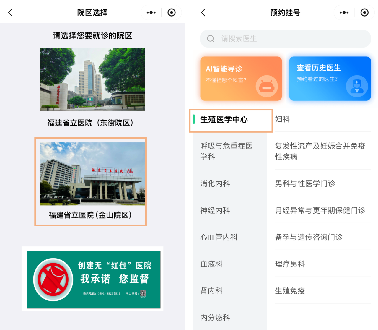 (首页处点击“就医服务”→ “预约挂号” → 金山院区→生殖医学中心门诊。)