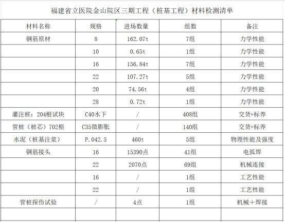 根据医院需求,现对福建省立医院金山院区三期工程之桩基工程材料检测服务项目进行市场竞价,现特向社会邀请各潜在供应商进行报价。具体要求如下: