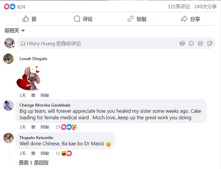 仰加圭转诊医院在其社交媒体账号上发布了这则讯息,吸引当地网民转赞评近千次。他们热议:“很棒的团队,我会永远感激你们”、“中国医生是最棒的”。