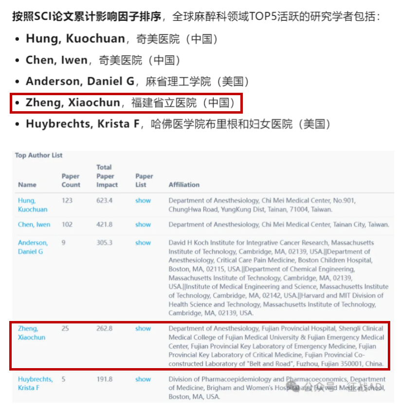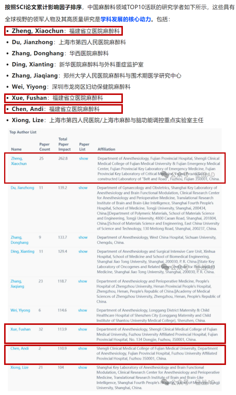 按照SCI论文累计影响因子排序,我院麻醉医学中心郑晓春教授、薛富善教授、陈安迪博士(导师:郑晓春教授)入选2024年中国麻醉学科临床科研领域TOP10最活跃的研究学者,其中,郑晓春教授排名国内第一位