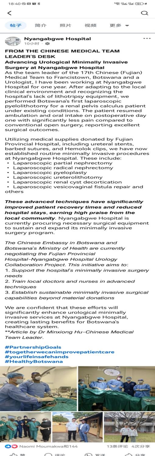 近日,博茨瓦纳仰加圭转诊医院在其Facebook(脸书)官网上报道中国(福建)第17批援博茨瓦纳医疗队在推动泌尿外科发展方面的工作进展。文章表示,作为第17批援博医疗队弗朗西斯敦分队队长兼泌尿外科医生的胡敏雄,已在仰加圭转诊医院工作一年。在适应了当地临床环境并了解到当地医院缺乏碎石设备后,胡敏雄利用现有条件为一名肾盂结石患者实施了博茨瓦纳首例腹腔镜肾盂切开取石术。与传统开放手术相比,患者术后第一天即可恢复下床活动和进食,疼痛明显减轻,手术效果极佳。