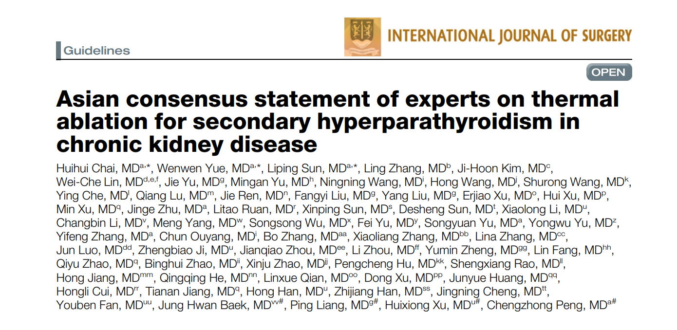 我院内分泌与代谢病医学中心专家作为核心成员,联合亚太地区权威专家,共同制定了《慢性肾病继发性甲状旁腺功能亢进热消融治疗亚洲专家共识》。这份具有里程碑意义的《亚洲共识》,已在国际著名外科期刊《International Journal of Surgery (IJS)》正式发布。