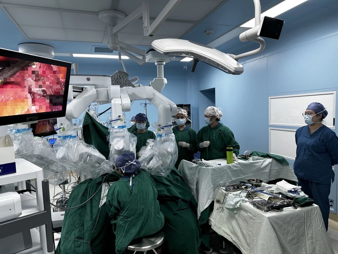 手术由周全副主任医师主刀,杨云玲、黄冰清医师协助,麻醉与护理团队全程护航,整个过程流畅而高效。国产手术机器人在其中发挥了关键作用:其高清三维视野可清晰呈现盆底深层解剖结构,机械臂操作精准灵活,能够在有限空间中完成比人手更稳定的缝合与重建,极大减少组织损伤和出血。