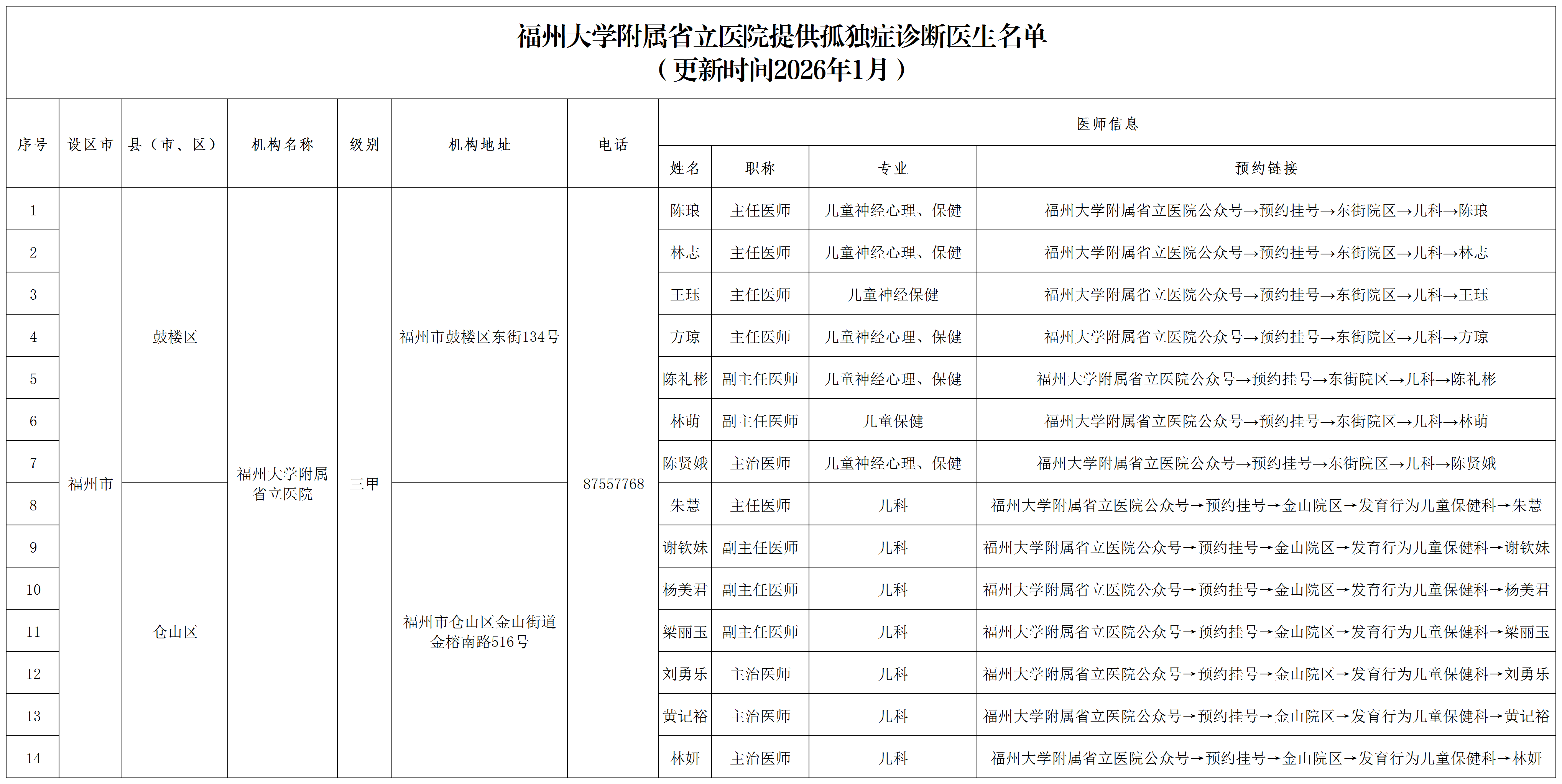 福州大学附属省立医院提供孤独症诊断的医师名单