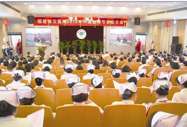 本报讯  6月26日下午,福建省立医院庆祝2012年中国医师节表彰大会在院8号楼国际学术厅隆重举行,院领导、国务院特殊津贴专家代表、从医30年医务人员、临床医技科室、行政职能科室主任、护士长代表、进修生代表等近300人参加。会上,省卫生厅党组书记、厅长陈秋立,福建省保健委员会常务副主任、厅党组成员、我院院长林才经教授等领导为获得荣誉证书的医务工作者颁发证书。朱鹏立书记、副院长主持大会,魏世超副书记宣读表彰决定,从医30年医务工作者代表欧德彬主任、年青医师代表陈刚主任分别在会上发言,全体与会人员重温了《中国医师宣言》。