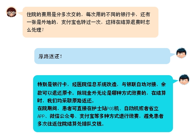 为了让患者少奔波,我们把入院办理和出院结算的服务功能全部前移到病区床边,一站式服务,无需到窗口排队结算,整个结算过程仅需要不到10分钟,尤其对于缺少家属陪同、行动不便的患者更是在时间、体力、精力上都得到了节约,提升效率,方便群众。