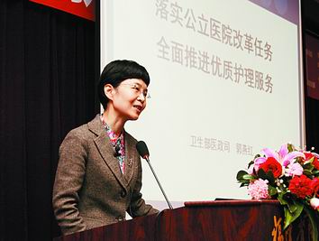 郭燕红副司长作了《落实公立医院改革任务,全面推进优质护理服务》的精彩报告。她从卫生部顶层设计的高度、从全国公立医院改革的深度,介绍全国开展优质护理服务工作的进展情况,形象地归纳为“三提高”(患者满意度明显提高,护士责任感明显提升,病人表扬信明显增多)、“三下降”(家属陪护和自聘护工比例降低,病人投诉、纠纷率降低,不良事件发生率降低)、“三形成”(形成责任制的整体护理工作模式,形成以临床为中心、以病人为中心的格局,形成全面履行护理职责、不断丰富和拓展护理服务的行业新局面)。郭副司长从护理专家、高层护理管理者的角度阐述了如何认识和实施优质护理服务,开展优质护理服务对于护理专业的重要意义,指出以病人为中心的工作模式体现出护士的专业价值,照护病人是护理安全的重要防线,优质周到的服务是医学人文精神的体现,是医学局限性的有力支持,对于病人照顾性工作与治疗性工作同等重要。最后郭副司长提出了2011年优质护理服务示范工程的工作思路和目标,要求紧紧围绕“改革护理模式,履行护理职责,提供优质服务,提高护理水平”的工作宗旨,充分调动临床一线广大护士工作的积极性,使公立医院为更多的患者提供全程、全面的优质护理服务,提高患者满意度。