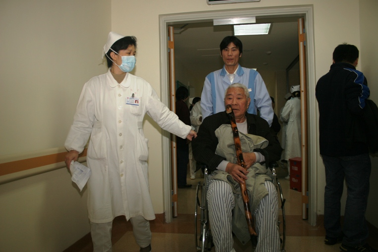 医护人员护送患者高高兴兴搬入新病房大楼。