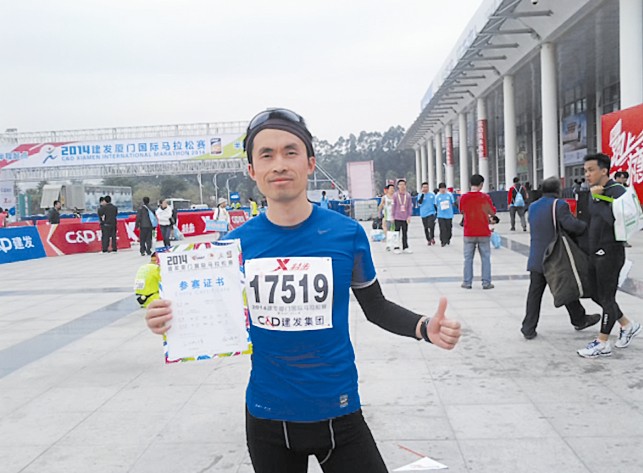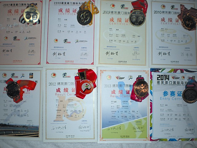 从2007年第一次站在厦门国际马拉松赛场,到2014年还是同样的赛场,七年来每年一次的厦马,我从未失约。从初马的刻骨铭心,跑跑停停坚持到最后的5小时,到如今一气呵成,行云流水般微笑着冲向终点的3个半小时。我一路跑来,跑道没有终点,在跑动中追逐我的梦想。1年2500公里,7年18000公里,我让跑步成为生活的一部分,让马拉松精神成为生命的依托。