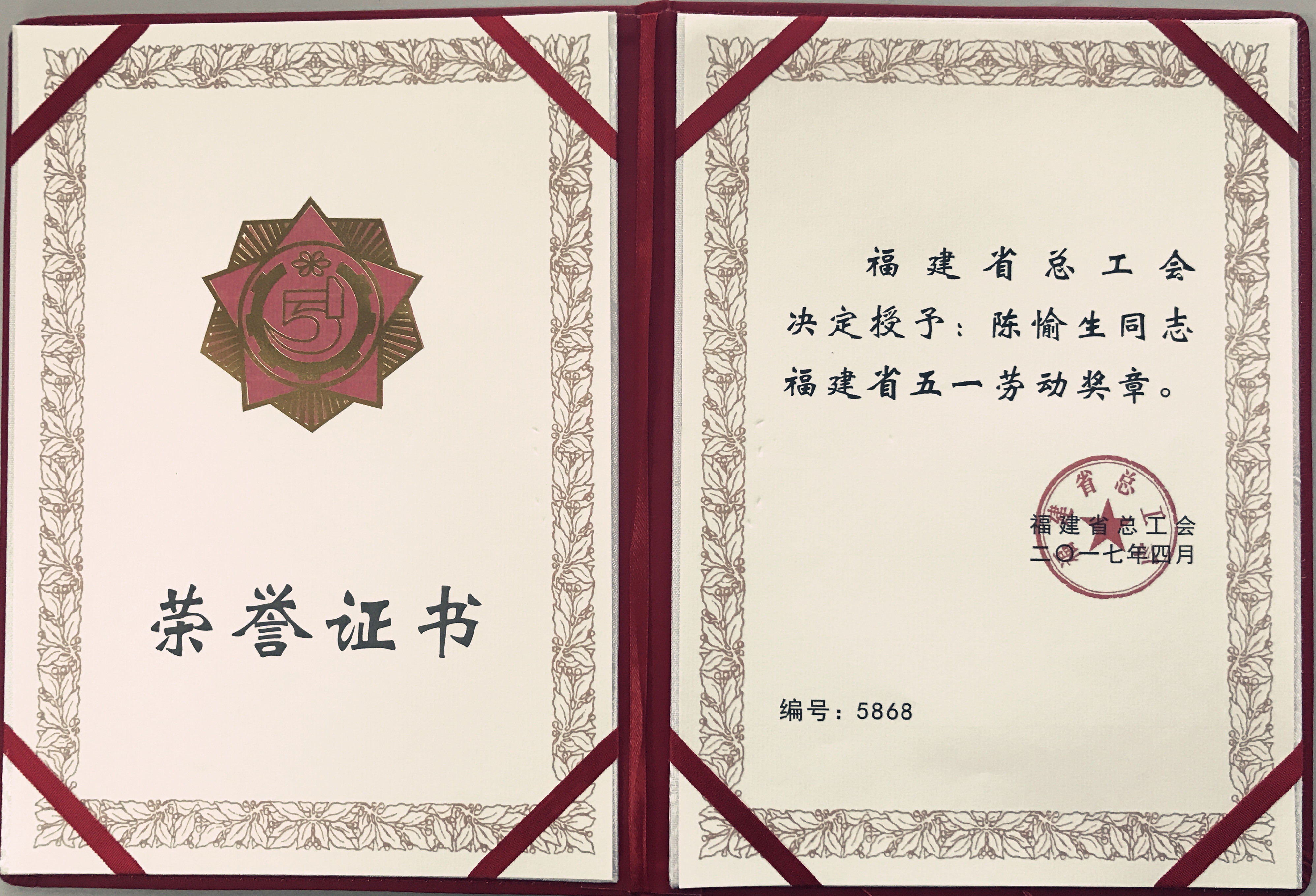 4月27日,福建省总工会在福建会堂召开“八闽工匠”事迹报告会暨表彰先进大会,颁发2017年全国、福建省五一劳动奖章(奖状)、全国工人先锋号证书。我院陈愉生教授参加颁奖仪式,并荣颁福建省五一劳动奖章。
