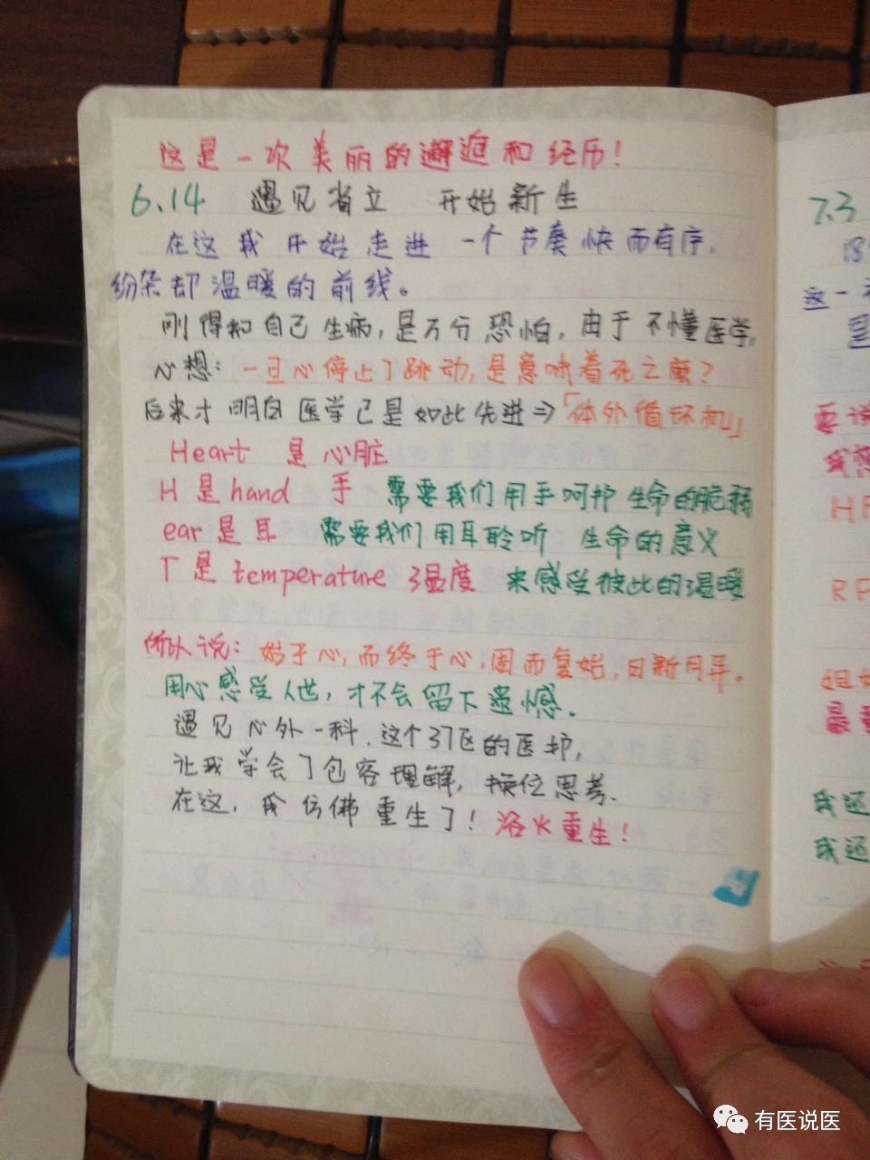 “在这,我开始走进一个节奏快而有序,纷杂确实温暖的前线。由于不懂医学,心想‘一旦心停止了跳动,是不是意味着死亡’。后来才明白医学已是如此先进,有体外循环机(在手术中代替停跳的心肺)。Heart是心脏的英文,拆开来就是H(hand)是手,需要我们用手呵护生命的脆弱;ear是耳,用来聆听生命的意义;T(temperature)是温度,来感受彼此的温暖。”