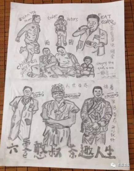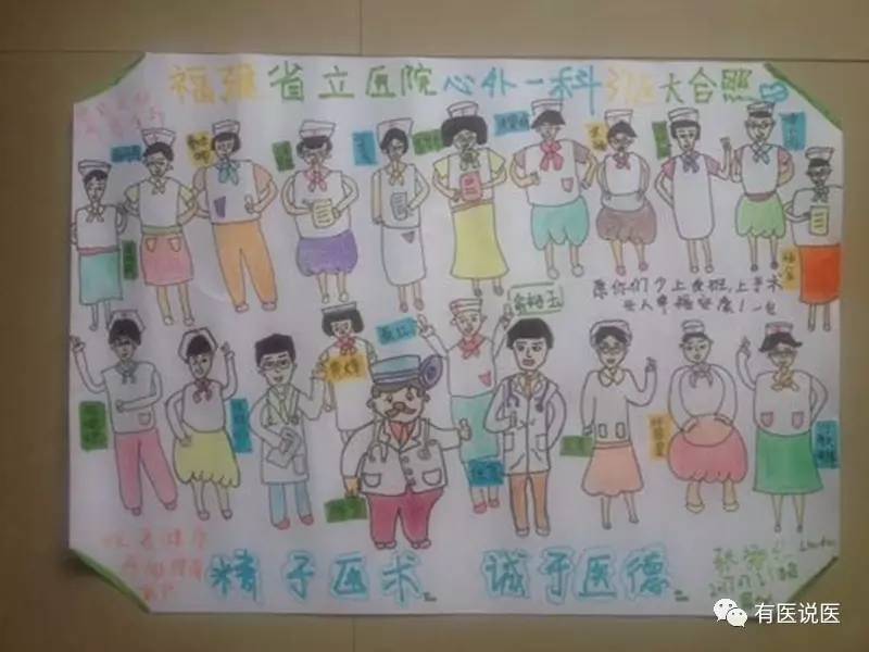 7月14日,“包子”康复出院,给福建省立医院心外一科画了一幅全家福。还给几个医生画了画像,还写了藏头诗表示感谢。