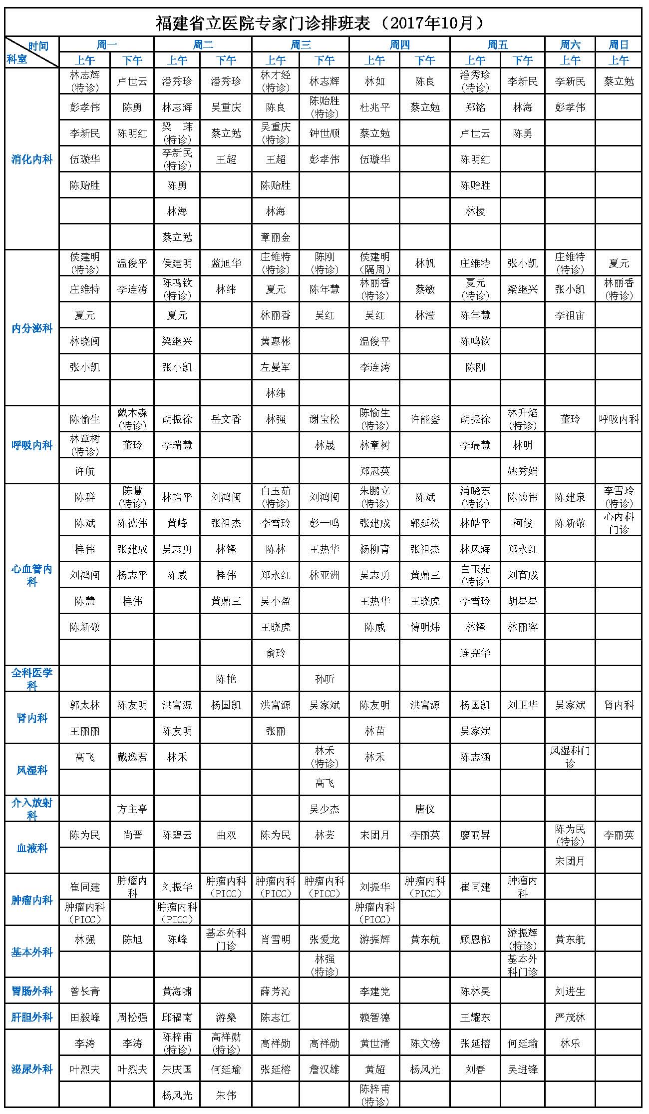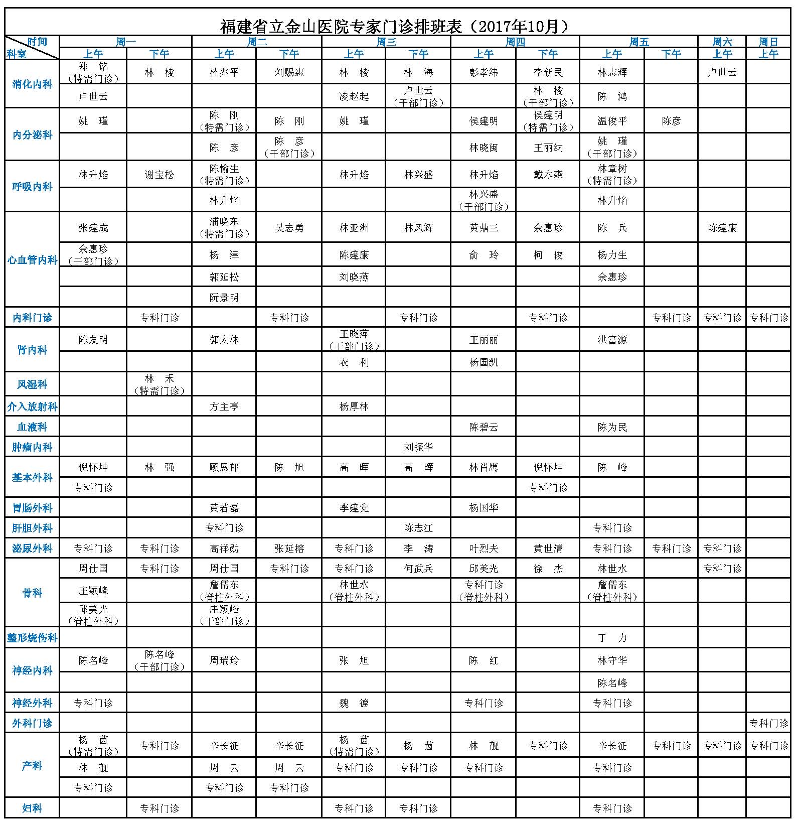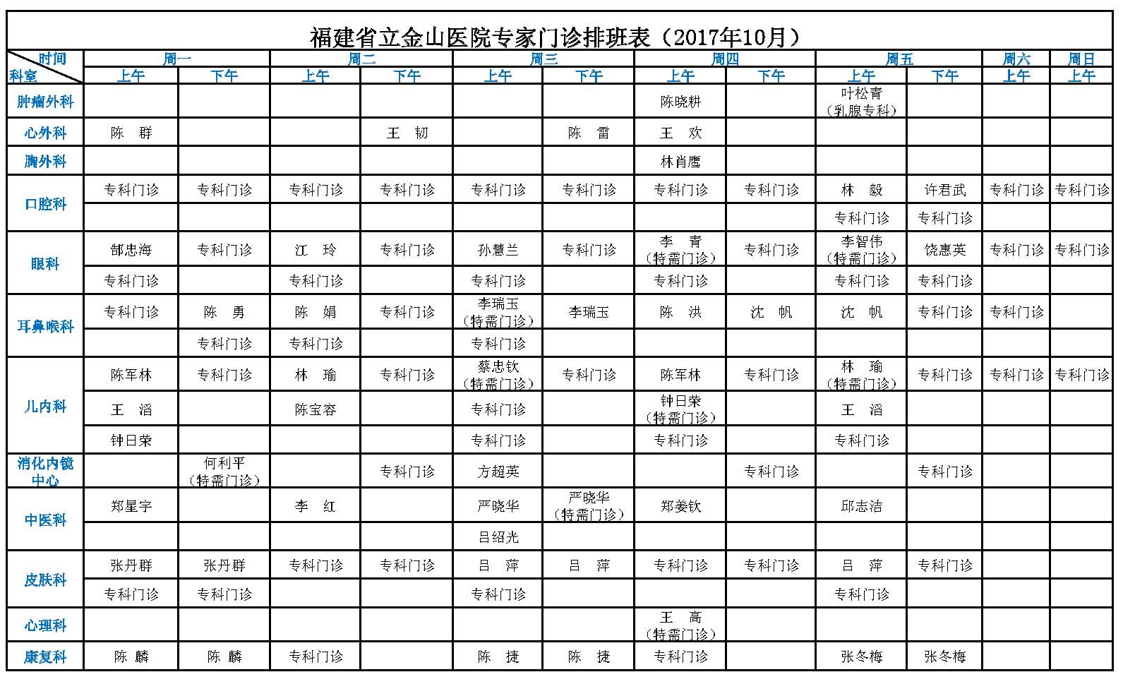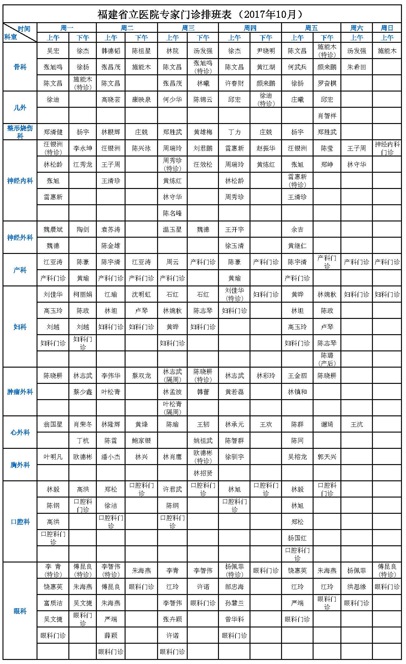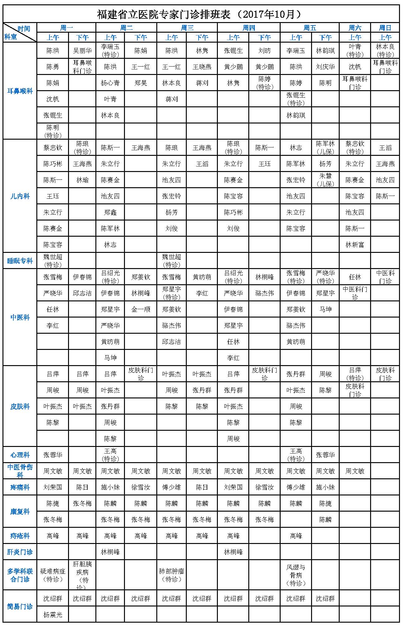 【收藏】福建省立医院、省立金山医院2017年10月最新专家门诊一览表